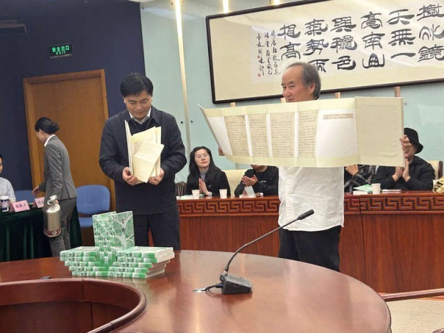 刘亮程在捐赠仪式现场展示自己的手稿。中青报·中青网记者李桂杰/摄