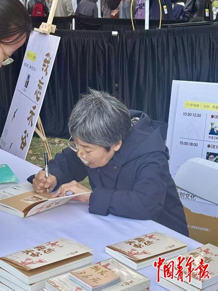 在初冬午后的上海鲁迅公园草坪,中青报·中青网记者看到,一群年轻人排起长队等待签名。签名桌前,坐着王玉珍,笔名“我恋禾谷”。她戴着眼镜,伏案在新书扉页上一笔一画郑重书写。