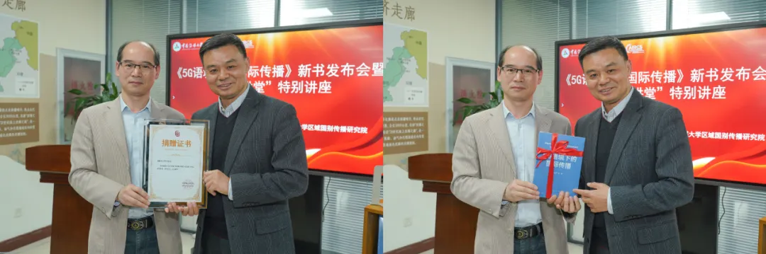 发布会上,江和平向图书馆赠书,龙小农馆长代表图书馆接受赠书并颁发捐赠证书。龙小农在致辞中表示,该著作为学校区域国别学与区域国别传播研究提供了重要学术支撑,图书馆将以此次发布会为起点,在区域国别学科馆常态化开展学术研讨,推动学科建设与国家战略需求深度衔接。