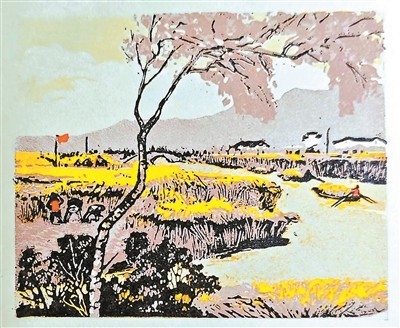 《江南春歌》里“十里桃花,十里杨柳”是诗的气,郑震把这气落成形:桃花是树顶的粉块,杨柳是树身的绿线,“十里”的绵延是画里田埂的曲曲折折,把诗里的空蒙变成可触摸的线条。诗里“青年小伙比劲头”的“劲”看不见,郑震用画里人影的弯腰、挥臂,把“劲”变成可见的动态——读诗看画,如站在田埂,听人笑、看花开,江南的春全活了。《桑林曲》里“采桑女的花衣像蝴蝶飞”是诗的灵,郑震把这灵刻成画里不同色块,在黑绿桑林里跳。诗里“修枝追肥”的实,郑震用桑树枝干的硬刻痕来应和,一灵一实,把桑林里的日子画成既飘蝶影又沾泥香的模样。诗里问“旧诗词里的采桑女可有这么美”,画里的采桑女没说话,可那提篮的姿势、花衣的艳已经回答了:旧诗词里的采桑女是愁的、怨的,严阵与郑震的采桑女是笑的、活的,这才是新时代的江南美。《开镰歌》的“一笔染黄了江南”是诗的狂,郑震用大块黄色承托,却又用刻痕的毛边,把这“狂”收进江南的“稳”里——江南的丰收,再盛也是水田里长出来的,再狂也脱不了水的底子。诗里“麦香似酒”的浓,郑震用画里“金船”的黄来应和,船在水上走,把稻的香、人的汗、阳光的热全搅进水里,水也成了酒,晃一晃,满河都是醉人的黄。读诗看画,如坐在稻场,闻着麦香、看着船来,江南的秋把人醉了。《琴泉》是最妙的共生。严阵的诗把烈士的魂寄在泉水里,“没有奏完的进行曲”由泉水接着奏;郑震刻出硬邦邦的黑黢黢的山崖,却用那道白瀑布的软,把诗里的柔情兜住。诗的“柔”与画的“硬”,撞出江南的骨血——江南不只有桃花杨柳的软,也有大山大水的硬,有采桑插秧的暖,更有烈士鲜血的热。这便是“诗画总关情”:诗为画立魂,画为诗塑形,少了诗,画就成无魂的木刻;少了画,诗就成无形的风,却何处寻那江南的活色生香?
