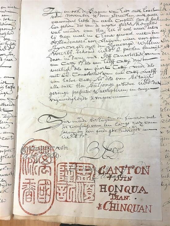 例如,荷兰国家档案馆(位于海牙)收藏了丰富的广州十三行商贸文献,其中包括清雍正七年(1729)广州十三行商陈芳官、陈钦官与荷兰东印度公司签订的茶叶商贸文件。该文件不仅盖有中文印章“盈顺隆记”与荷兰文印章“CANTON Sjin HONQUA THAN CHINQUAN”;还加盖了一枚广告印章,印文为“万国流香”。这应是目前所见中国最早的海外茶叶广告,生动反映了通过广州十三行,神奇的小小茶叶承载着中华文明,成为中西物质与文化交流的重要媒介。中国茶叶以其绝佳品质,使香气与美名流传万国,吸引世界各地的仰慕者前来寻访、品鉴与贸易,深刻影响了世界社会的生活方式及相关制度的变迁。