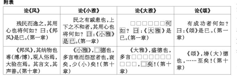 与此同时,这种做法背离了早期《诗经》学体系中“风”“雅”“颂”分层设计的政教伦理架构。“风”“雅”“颂”在政教伦理层面的等差,最早系统地呈现于季札之评周乐,如其评《风》之《周南》《召南》瞩目于“始基”,评《小雅》瞩目于“周德之衰(小)”,评《大雅》瞩目于“文王之德”,评《颂》瞩目于“盛德之所同”等。但孔子《诗经》学体系后来居上,上博简所见《孔子诗论》牢固确立了《风》《雅》《颂》三者的政教伦理境界之差等(参见附表):